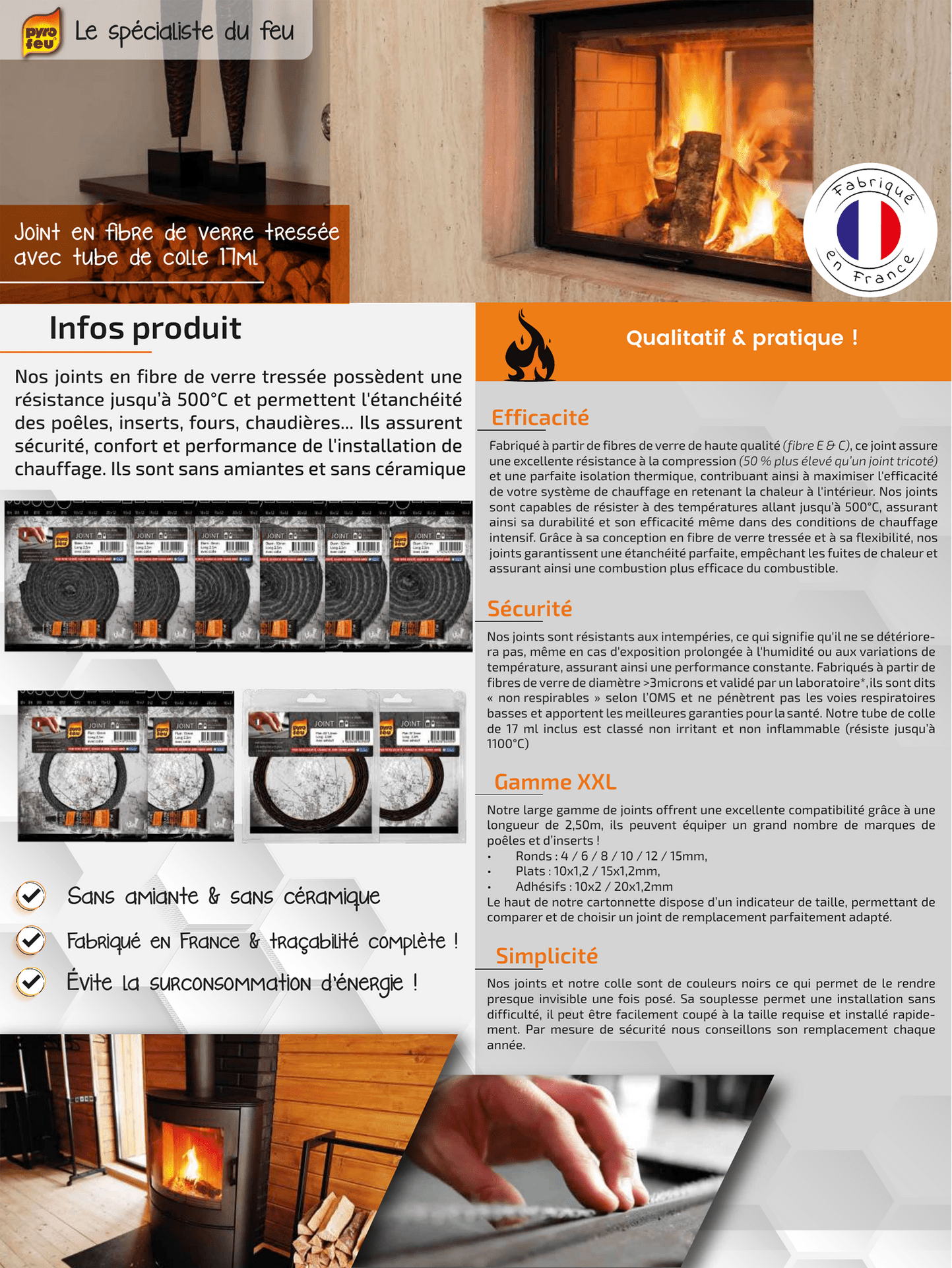 Alliez sécurité, performance et praticité avec le joint en fibre de verre tressée PYROFEU, conçu pour assurer une parfaite étanchéité de vos poêles, inserts, fours et chaudières.Caractéristiques principales :