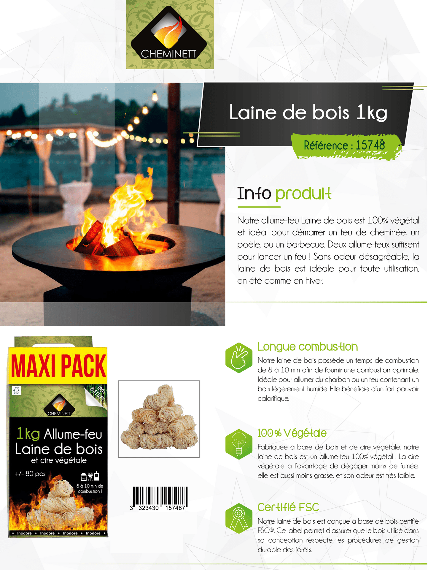 Allumez vos feux naturellement avec la Laine de bois allume-feu Cheminett, 100 % végétale et écologique. Fabriquée à partir de bois et de cire végétale, cette laine d’allumage offre une flamme puissante, propre et inodore, parfaite pour allumer un feu de cheminée, un poêle ou un barbecue. Deux allume-feux suffisent pour démarrer un feu rapidement, même avec du bois légèrement humide. Grâce à son grand format 1 kg, profitez d’un stock durable et économique pour toute la saison.