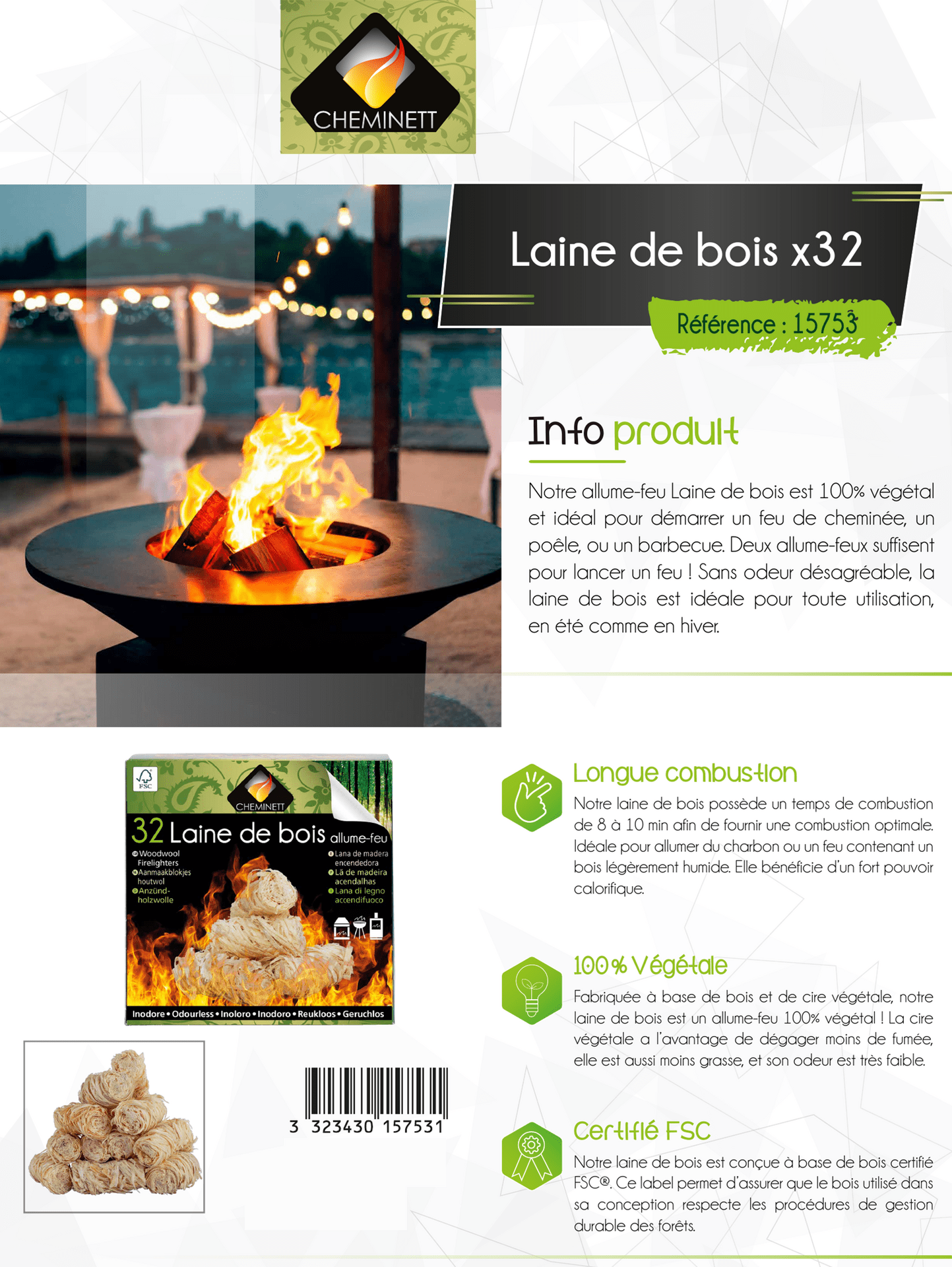 Allumez vos feux facilement et naturellement avec la Laine de bois allume-feu Cheminett! Composée à 100 % de fibres de bois et de cire végétale, cette laine d’allumage est écologique, inodore et sans produit chimique. Deux allume-feux suffisent pour démarrer un feu de cheminée, un poêle à bois ou un barbecue, même avec du bois légèrement humide. Sa flamme propre et puissante assure une mise en route rapide et efficace de votre feu, été comme hiver.