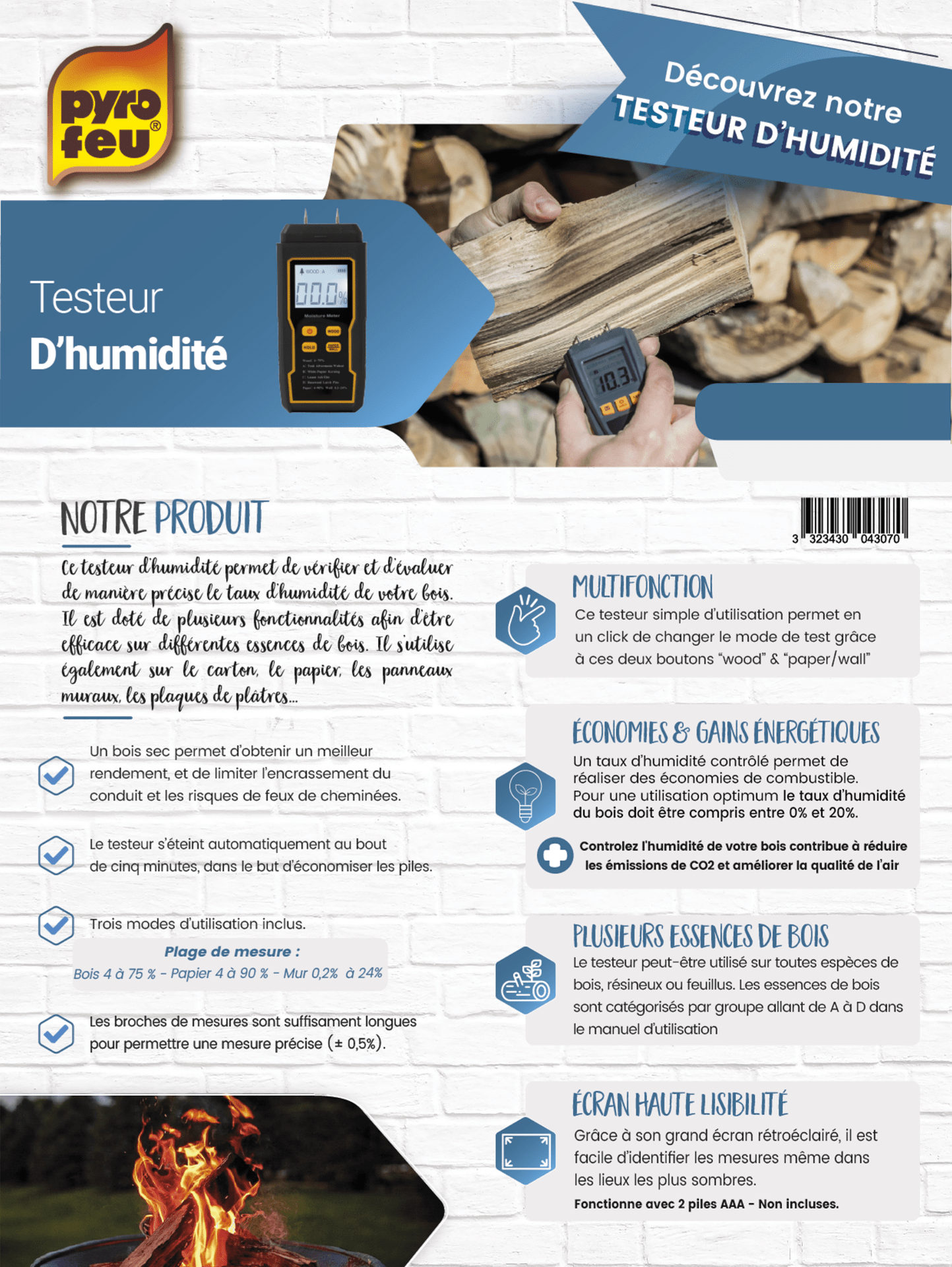 Le testeur d’humidité Pyrofeu vous permet de mesurer avec précision le taux d’humidité de votre bois afin d’optimiser sa combustion et d’éviter l’encrassement du conduit de cheminée. Polyvalent et simple d’utilisation, il convient également pour le carton, le papier, les murs et les panneaux muraux. Grâce à son grand écran rétroéclairé, vous obtenez des mesures claires et lisibles, même dans les endroits peu éclairés.Fonctionnalités principales :